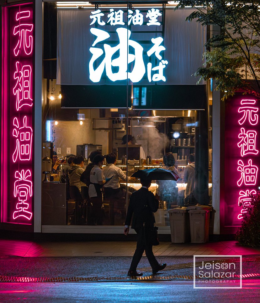 Captura nocturna de un restaurante tradicional japonés en una calle tranquila del distrito de Minato. La luz cálida de los neones y la arquitectura crean una atmósfera acogedora que invita a descubrir la vida local de la ciudad. La escena refleja la armonía entre la tradición y la modernidad en el entorno urbano japonés.