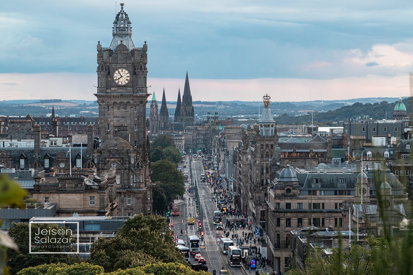 Vista panorámica del centro histórico de Edimburgo, con la icónica torre del Balmoral Hotel en primer plano y la arteria de Princes Street repleta de vida. Esta imagen captura el equilibrio perfecto entre la arquitectura clásica escocesa y la energía urbana de una ciudad vibrante, enmarcada por colinas al fondo.